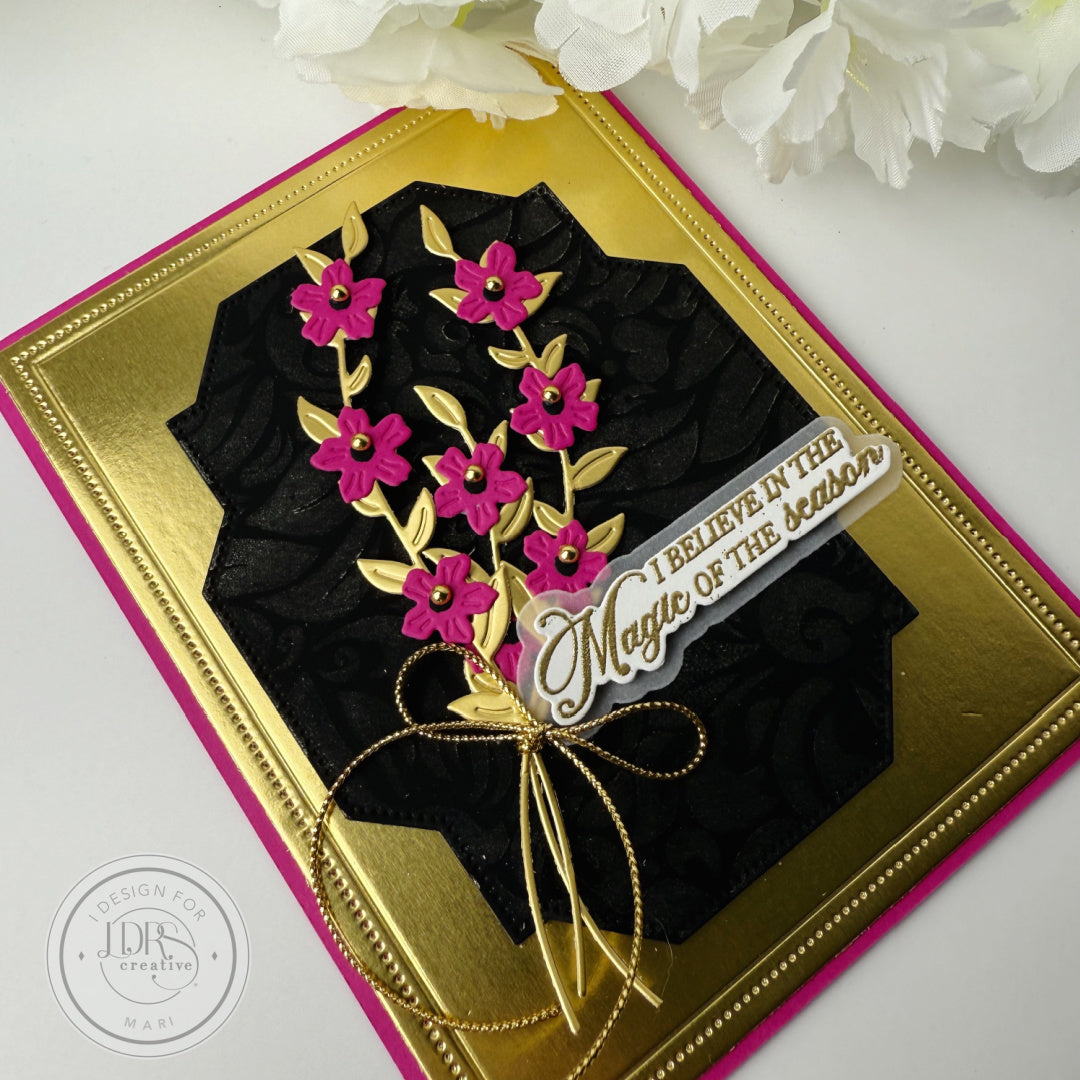 Mari makes her LDRS Creative debut with a breathtaking floral holiday card! 🌸✨ Follow along as she combines bright pink, bold black, and gold for a modern, elegant look. Featuring the Floral Reverse Background Stamp and Petite Petals Dies, this project is full of beautiful details and creative inspiration you won’t want to miss.